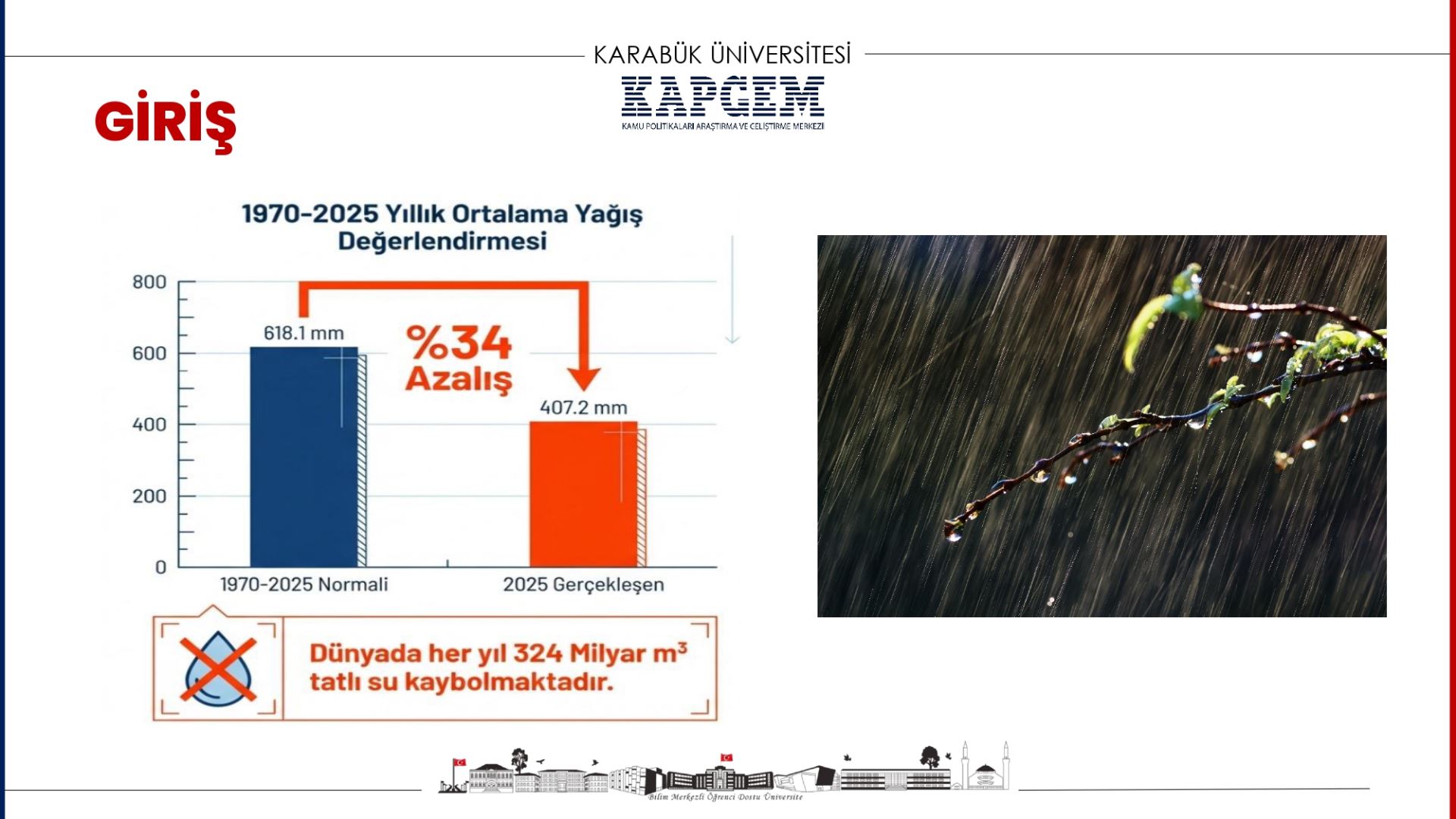 Rapor sunumunda, yağış verilerinin kuraklık riskini büyüttüğüne dikkat çekildi. Sunumda paylaşılan grafiklere göre 1970–2025 dönemi ortalama yağış değerinin 618,1 mm seviyesinde olduğu; 2025 gerçekleşen yağışın ise 407,2 mm’ye gerilediği ve bunun yaklaşık %34’lük bir düşüşe karşılık geldiği belirtildi.
